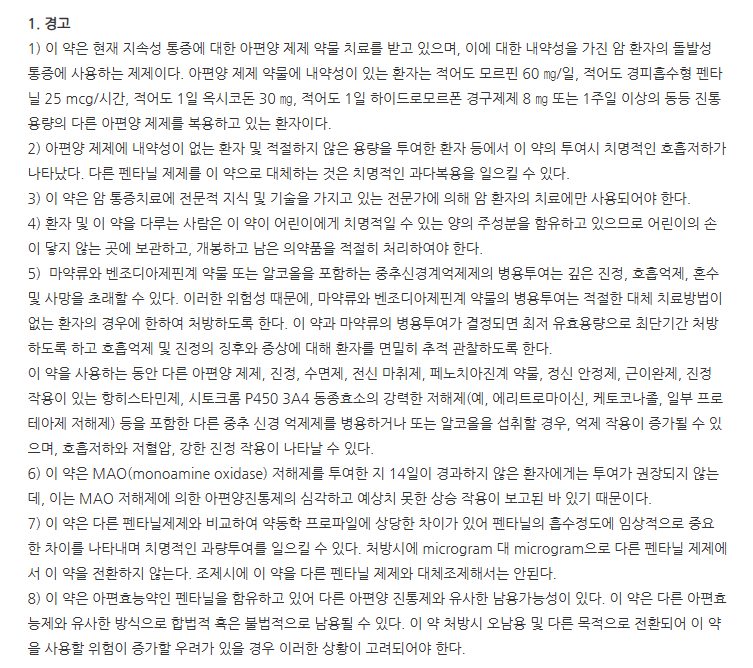 - 펜타닐 또는 구성 성분에 과민증이 있는 환자 사용 금지